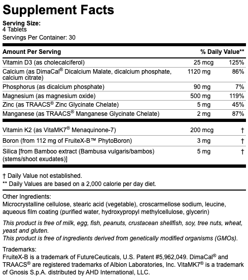 • 본 제품은 상표 등록된 칼슘, 마그네슘, 아연, 보론, 비타민 D, 비타민 K2, 인산, 망간, 실리카가 함유된 뼈 건강의 완벽한 처방입니다.